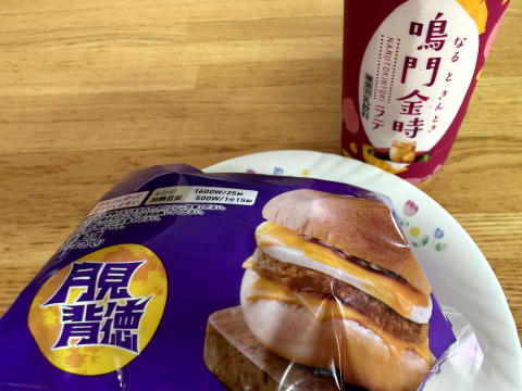 朝は、ファミマの 月見背徳バーガー、鳴門金時ラテでした。