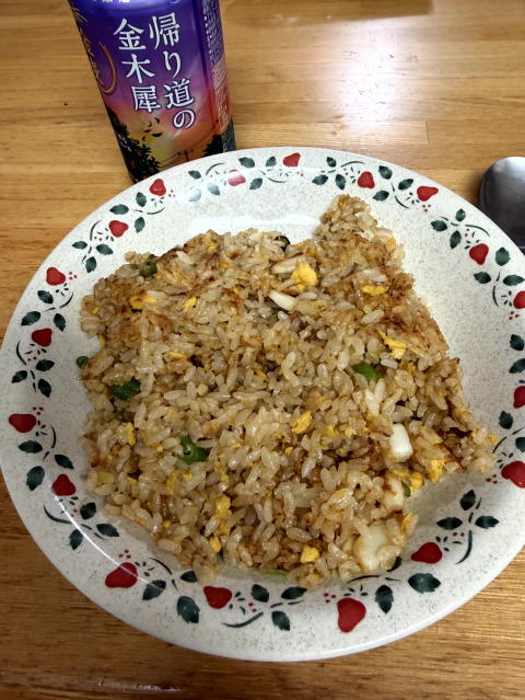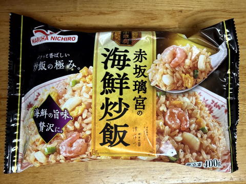夜は、冷凍の 赤坂離宮海鮮チャーハンをフライパンで炒めました。