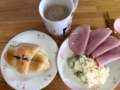 朝は、明太バターサンド、ポテサラ+ロースハム、コーヒーでした。