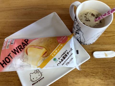 朝は、ファミマのトルティーヤ(ハム&濃厚チーズ)、コーヒーでした。