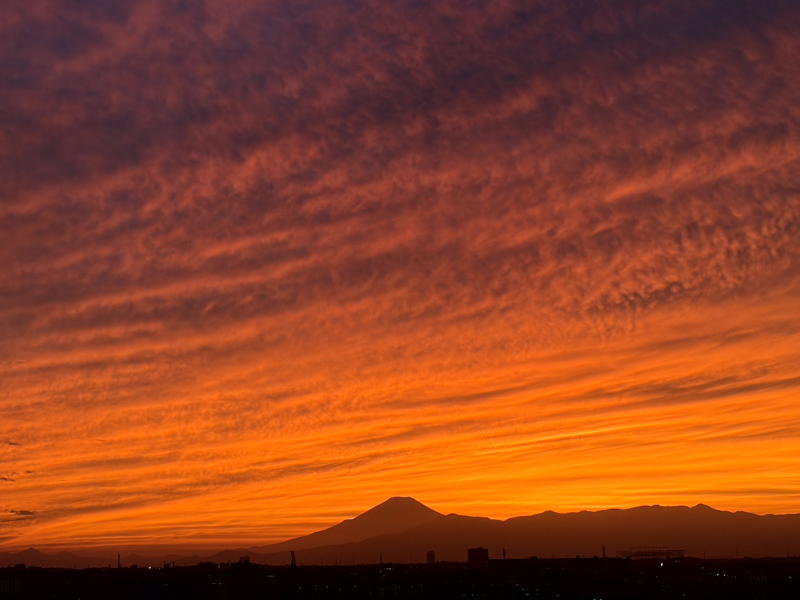 夕方、18:00頃に起き上がって、外を見たら真っ赤な夕焼け空でした。富士山が影になっています。富士山の右手前は丹沢山塊です。