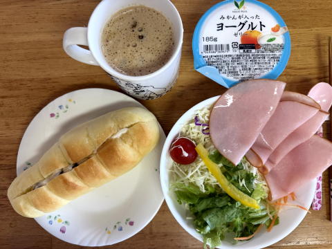 朝は、ラムレーズンサンド、サラダ+ロースハム、ヨーグルトゼリー、コーヒーでした。