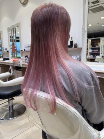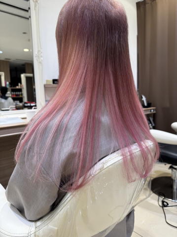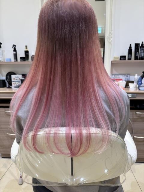 照明の色合いでピンクに見えますが、さくら色グラデーションです。さくら色は、ハイトーンのピンクなんですが、元の髪色をブリーチして脱色しないと、この色になりません。黒髪や、お洒落染めの茶髪程度だと、この色は出せないので、まず前半にブリーチをして白っぽい金髪にしてからさくら色を入れていきます。