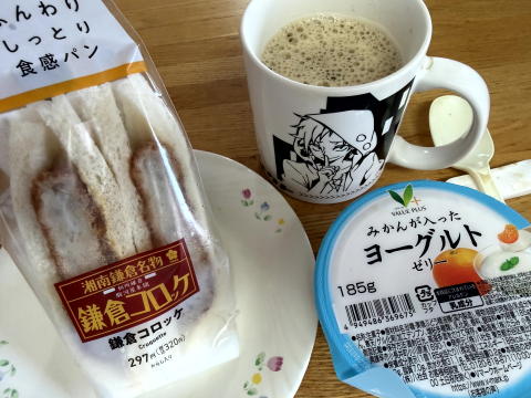 朝は、鎌倉コロッケサンド、みかんヨーグルト、コーヒーでした。