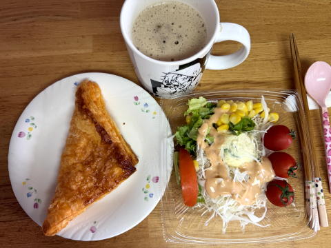 朝は、キャラメルパンプキンパイ、サラダ+ミニトマト、カフェオレでした。