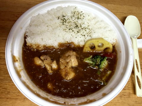夜は、ファミマで 炒め玉ねぎ香る! 彩り野菜のスパイスチキンカレーでした。