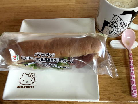 朝は、セブンイレブンのバゲットサンド(パストラミビーフ&北海道クリームチーズ)、カフェオレです。