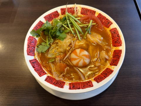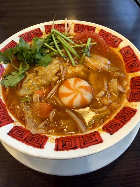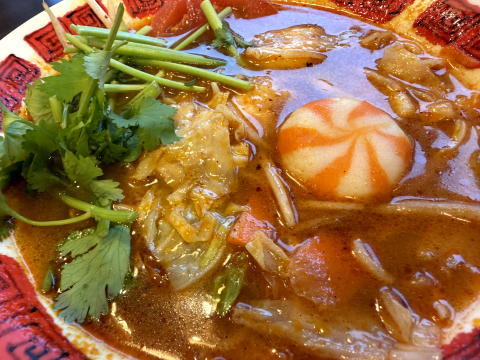 昼は 14:00過ぎに、バーミヤンでトムヤム麻辣湯(春雨麺)です。パクチーましましは別料金がかかるので、ふつうで。紅白の丸いものは小籠包です。