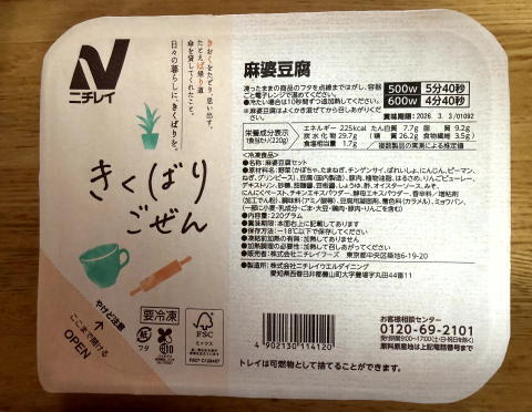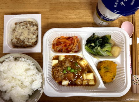 夜は、ニチレイフーズダイレクトの健康管理食(麻婆豆腐)、納豆でした。