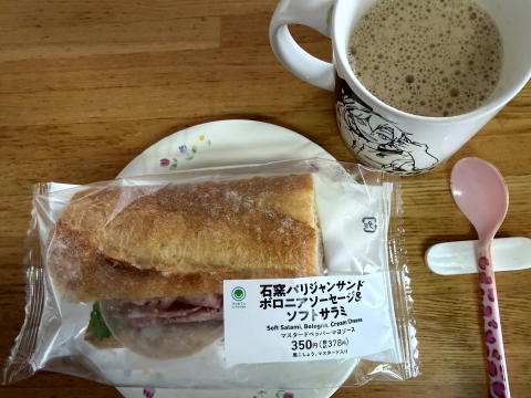 朝は、石窯パリジャンサンド ボロニアソーセージ&ソフトサラミ、コーヒーでした。(ファミマ)