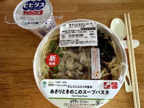 昼は、あさりときのこのスープパスタ、ヨーグルトでした。(ファミマ)