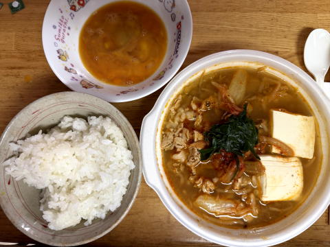 夜は、こく旨キムチ鍋、たまごかけごはんでした。(セブンイレブン)