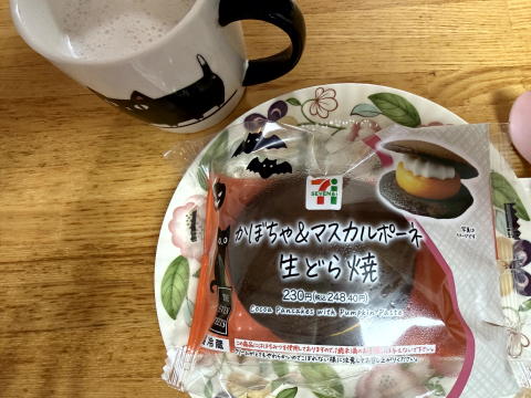 食後のデザートは、よそさまのブログで見た、かぼちゃ&マスカルポーネ 生どら焼き、ストロベリー・オワイトショコラ(ホット)です。(セブンイレブン)