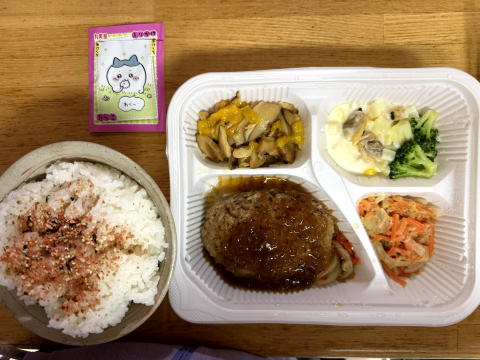 夜は、ニチレイフーズダイレクトの健康管理食(オニオンソースハンバーグ)、ちいかわふりかけでした。