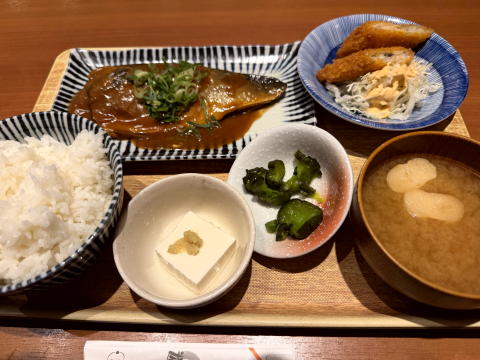 チコちゃん じゃなくて、看護師さんに叱られたら、お腹がすいて、肉豆腐定食屋で、木曜の日替わりランチの さば味噌煮定食(冷奴、白身魚フライ付き)を食べました。(1,000円)