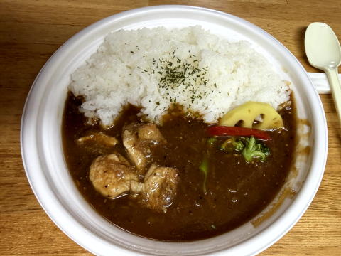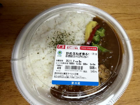 夜は、ファミマの炒め玉ねぎ香る! 彩り野菜のスパイスチキンカレーでした。