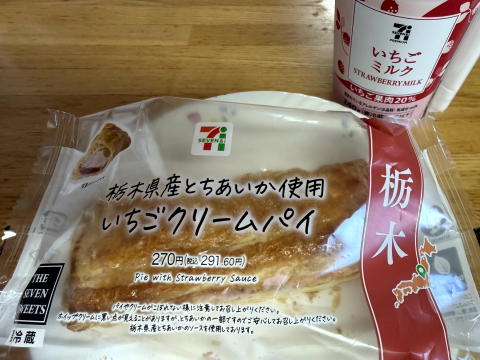 朝は、セブンイレブンの いちごクリームパイ、いちごミルクでした。