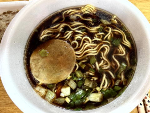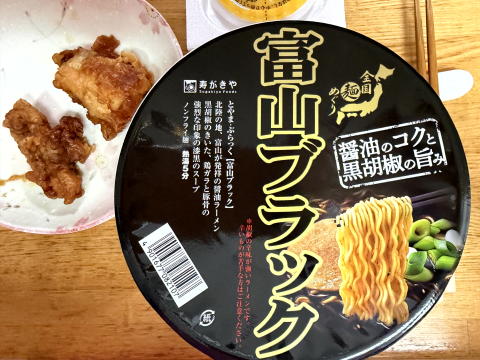 夜は、カップ麺の 富山ブラックラーメンと鶏唐揚げです。