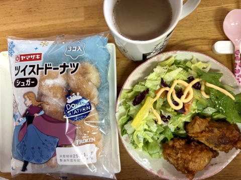 朝は、アナ雪のツイストドーナツ、サラダ+唐揚げ、コーヒーでした。