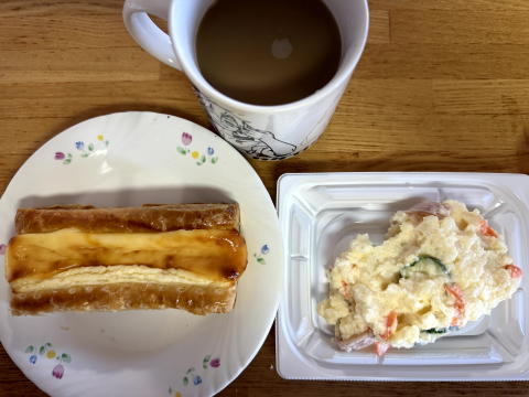 朝は、チーズパイ、ポテサラ、コーヒーでした。