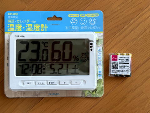 きのう、ヨドバシカメラで、大画面の壁掛けタイプの温度・湿度計を購入です。時計とカレンダーの表示もあります。