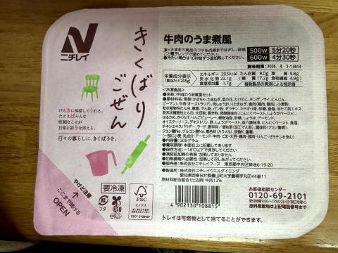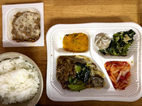 夜は、ニチレイフーズダイレクトの健康管理食(牛肉のうま煮風)、納豆でした。