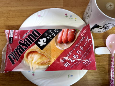 朝は、やまや 明太もちチーズ ピザサンド、コーヒーです。