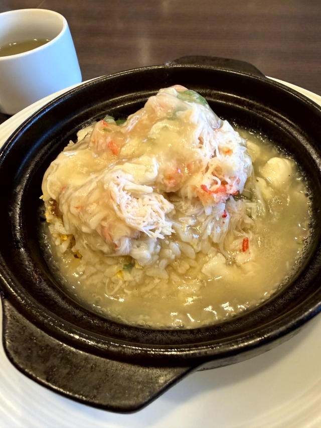 お昼は、バーミヤンで、本ずわい蟹あんかけ土鍋チャーハン(蟹3倍)でした。土鍋がアツアツで、あんかけをかけたら、じゅわわわわーっと。 ズワイガニは、+500円で 3倍になります。 1倍じゃ、ズワイガニが少なすぎるのでね。