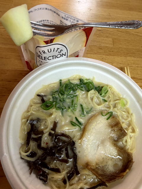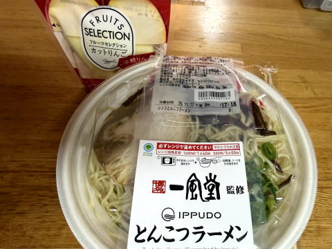 夜は、ファミマの 一風堂監修とんこつラーメン、カットりんごです。