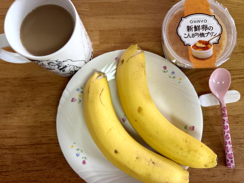 朝は、バナナ(2本)、焼きプリン、コーヒーでした。