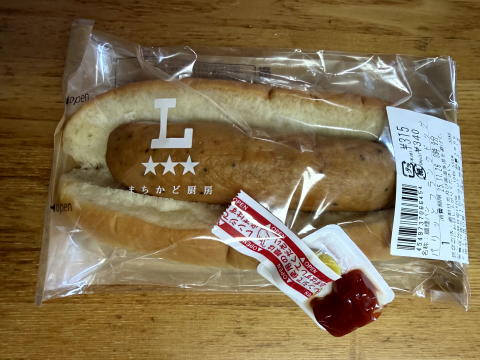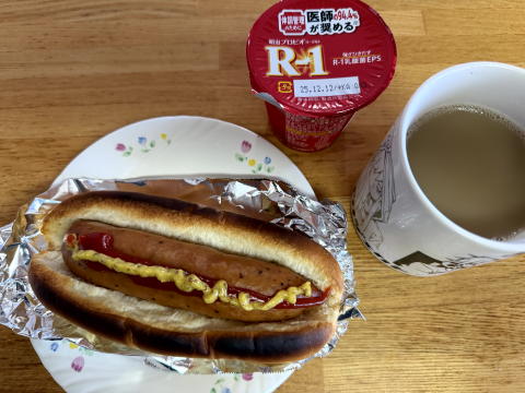 朝は、ローソンの大きなフランクフルトサンド、キャラメルラテ、ヨーグルトでした。