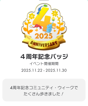 先週土曜から、ポケモンGO Plus +を持ってポケ活しているうちに、ピクミンブルームの4周年コミュニティウィークのタスク= 3万歩 あるく、をクリアして今年もバッジもゲットです。