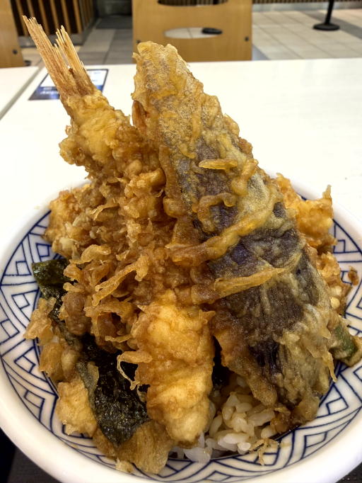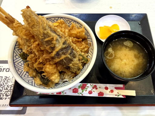 まずは、ラゾーナ川崎のフードコートにある 金子半之助で 江戸前天丼(味噌汁付き)でランチしました。