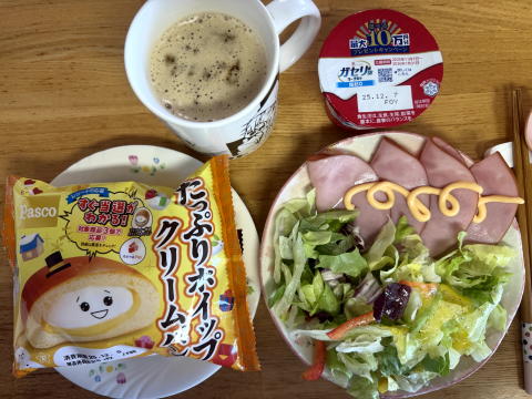 朝は、たっぷりホイップクリームパン、サラダ+ロースハム、コーヒー、ヨーグルトでした。