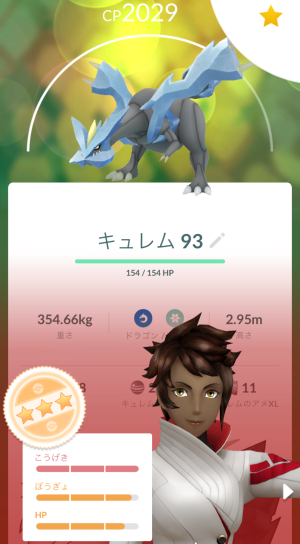 もともと 10匹ストックを持っていたのですが、2匹ゲットしました。レシラムやゼクロムと合体させるとき、キュレムの個体値が引き継がれるので、なるべく高個体値を探しましたが 100%はいなくて、93%でよしとしました。