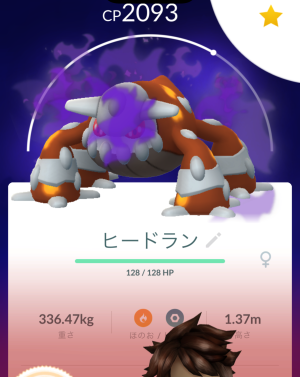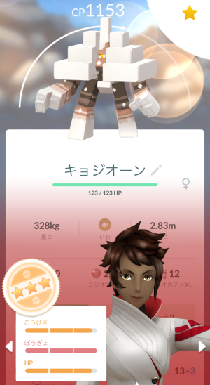 新しくでた 岩塩ポケモン コジオですが、3日目でアメが150個あつまったので、個体値が高いやつをキョジオーンに進化させました。いわタイプなので、使えるかな?!
