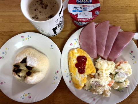 朝は、クリームチーズレザン、ポテサラ+たまご+ロースハム、コーヒー、ヨーグルトでした。