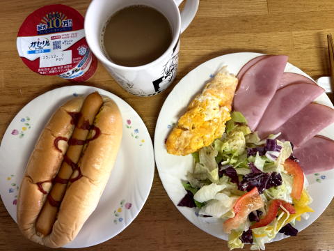 朝は、チョリソードック、サラダ+たまご*ロースハム、コーヒー、ヨーグルトでした。