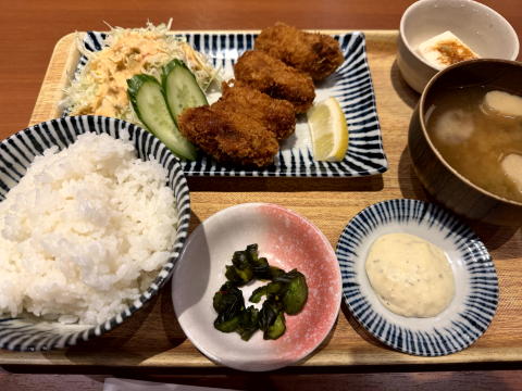 お昼は、肉豆腐定食屋で、期間限定の カキフライ定食でした。揚げたてのカキは衣がサクサクでカキがアツアツです。(1,045円)