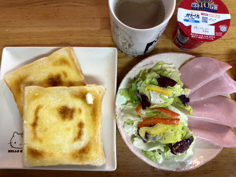 朝は、久しぶりにハローキティートースト、サラダ+ロースハム、コーヒー、ヨーグルトでした。