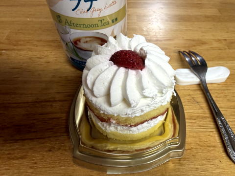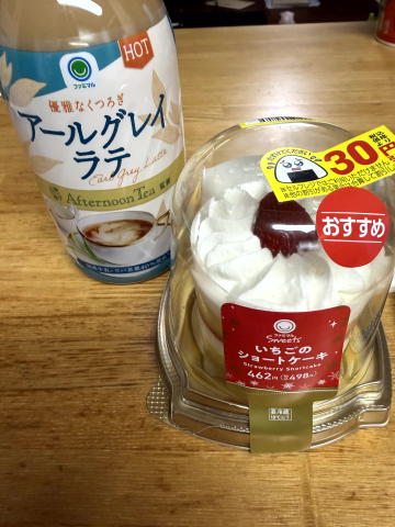 ティータイムにファミマのいちごショートケーキ(安売り)、アールグレイラテです。