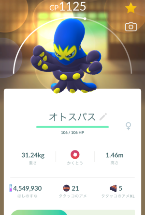 1匹ゲットできたら図鑑の通知機能をオンにするとニアバイに優先して出るようになるので、コジオのときは追っかけましたが、きょうは雨が降っているので追っかける気にならず、ポケモンGO Plus +のオートスローを起動しぱなしにしておいたら、夜には個体値のいいやつを含めて複数のタタッコがゲットできていたので、オトスパス(これも新ポケモン)に進化させました。