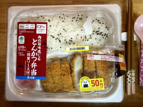 夜は、ファミマのとんかつ弁当でした。これ、10回くらいは(値引きのタイミングで)リピートしています。
