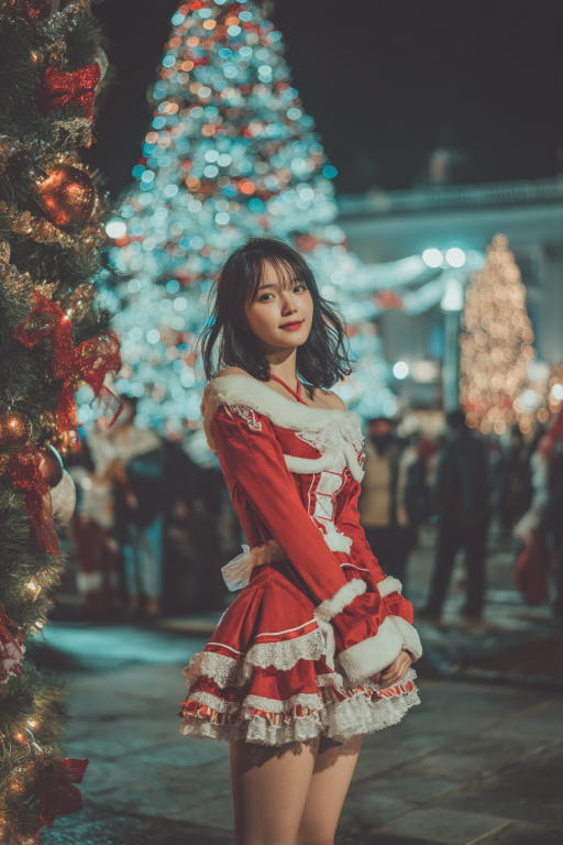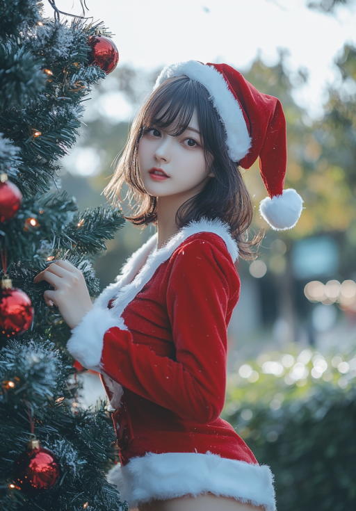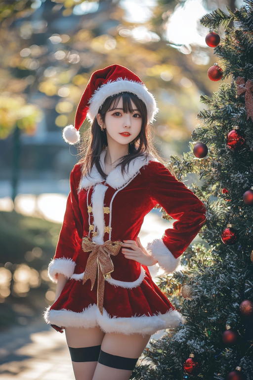 もうすぐクリスマスなので、クリスマスツリーとサンタの衣装のおねえさんを、ひとつ前のバージョンのMidjourney 6.1で生成しました。