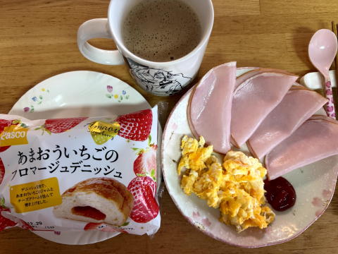 朝は、あまおういちごのフロマージュデニッシュ、ロースハム+たまご、コーヒーでした。