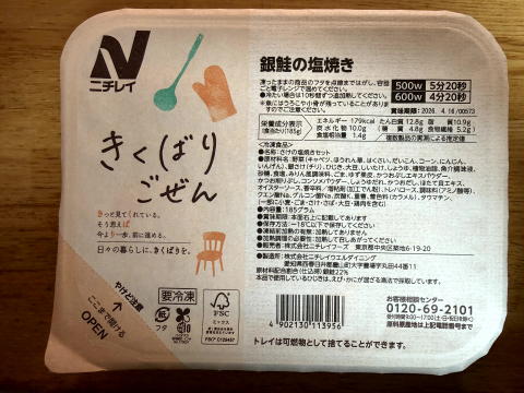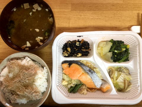 夜は、ニチレイフーズダイレクトの健康管理食(銀鮭の塩焼き)、減塩味噌汁、とろろ昆布でした。