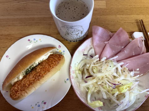 朝は、フィッシュフライサンド、オニオンスライス+ロースハム、コーヒーでした。