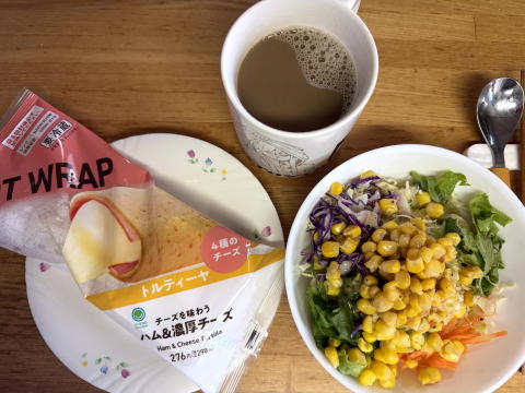 朝は、トルティーヤ(ハム&濃厚チーズ)、コーンサラダ、コーヒーでした。