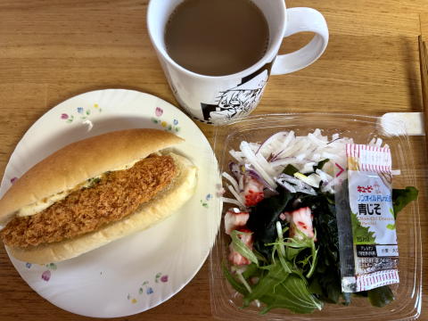 朝は、フィッシュフライサンド、海藻サラダ、コーヒーでした。