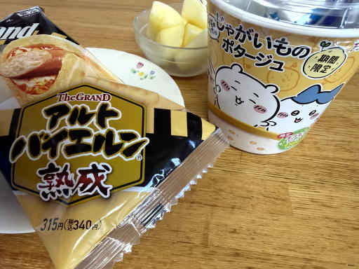 朝は、アルトバイエルン熟成ピザサンド、ちいかわ じゃがいものポタージュ、カットりんごでした。